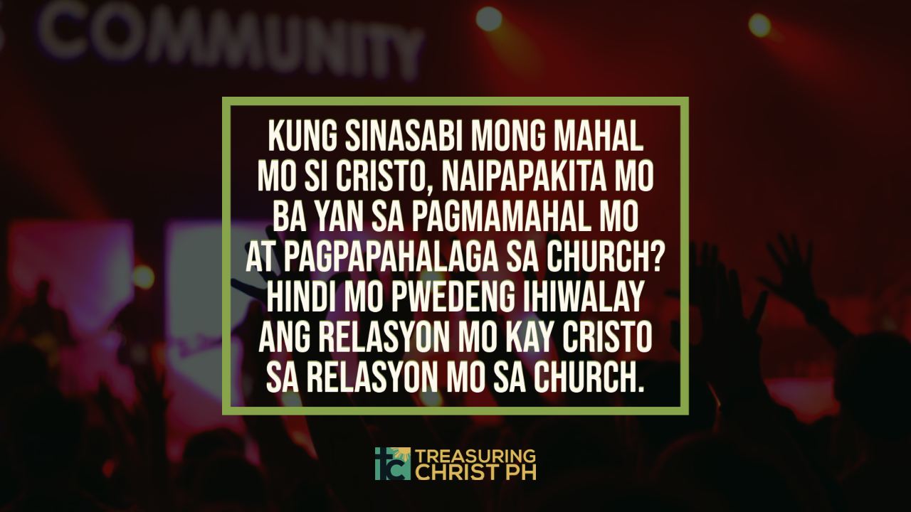 May implication din itong church as the body of Christ sa pagtrato natin sa church. Kay Cristo mismo natutunan ito ni Pablo nung magpakita si Cristo sa kanya sa daan papuntang Damascus. Sinabi ni Jesus sa kanya, nung time na Paul was leading the persecution of the church, “Ako ang inuusig mo” (Acts 9:4-5). Kung ano ang pagtrato mo sa church, parang kay Cristo mo na rin ginagawa. Yun ang ibig sabihin na ang church ay “body of Christ.” Yun ang ibig sabihin na ang church ay body of Christ. Kung sinasabi mong mahal mo at pinahahalagahan si Cristo, naipapakita mo ba yan sa pagmamahal mo at pagpapahalaga sa church? Hindi mo pwedeng ihiwalay ang relasyon mo kay Cristo sa relasyon mo sa church.